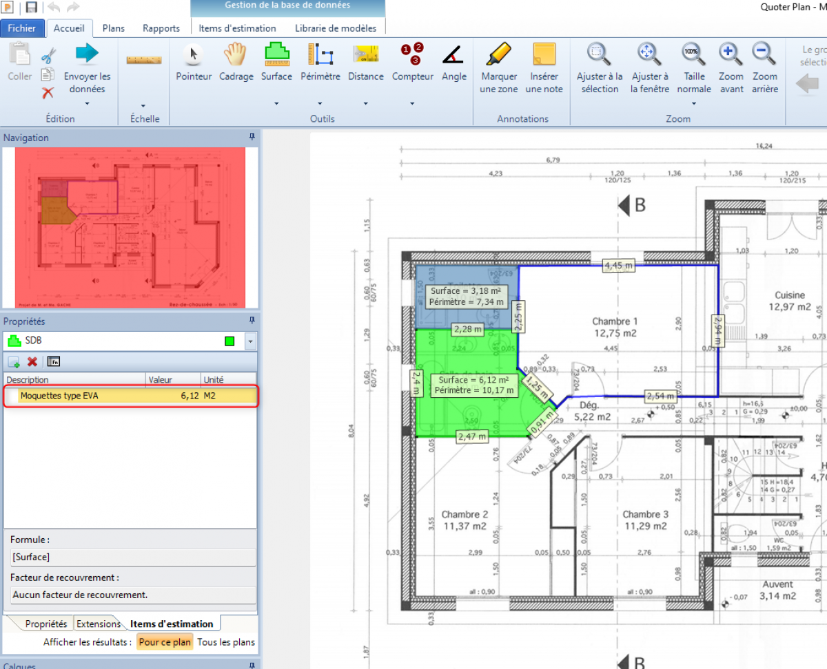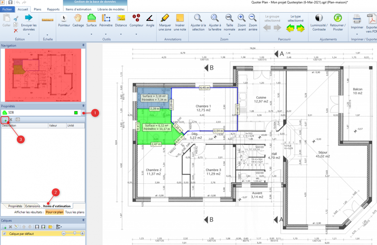 Calculez vos dimensions et quantités sur plans PDF à partir du logiciel Quoter Plan (surface, longueur…) et associez des ouvrages d’estimation à vos mesures.