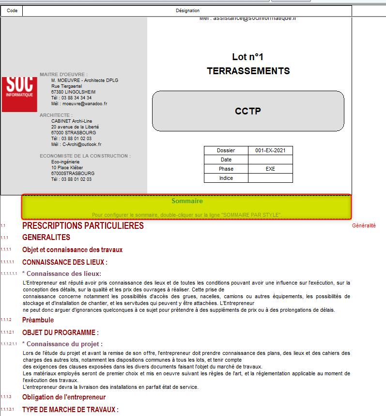 2. Accédez au document dans lequel vous souhaitez insérer un sommaire. (CCTP, DQE, etc...)