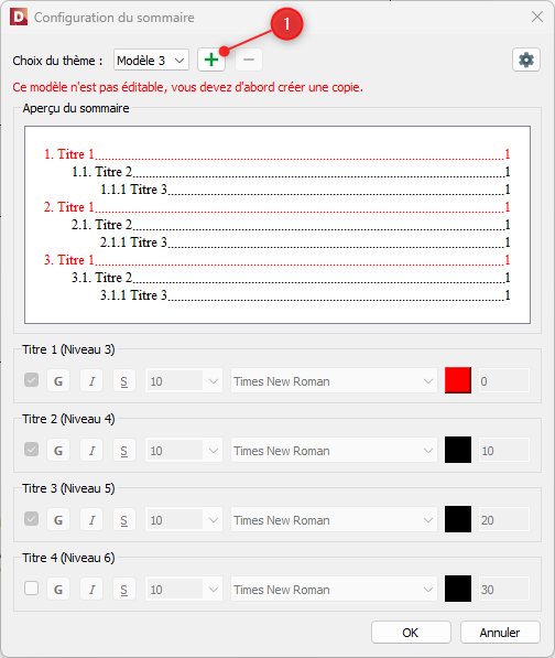 Si vous choisissez de créer un thème personnalisé pour votre sommaire, commencez par attribuer un nom à votre modèle. Configurez ensuite ce dernier en utilisant les outils disponibles afin d’adapter la mise en forme selon vos besoins.
