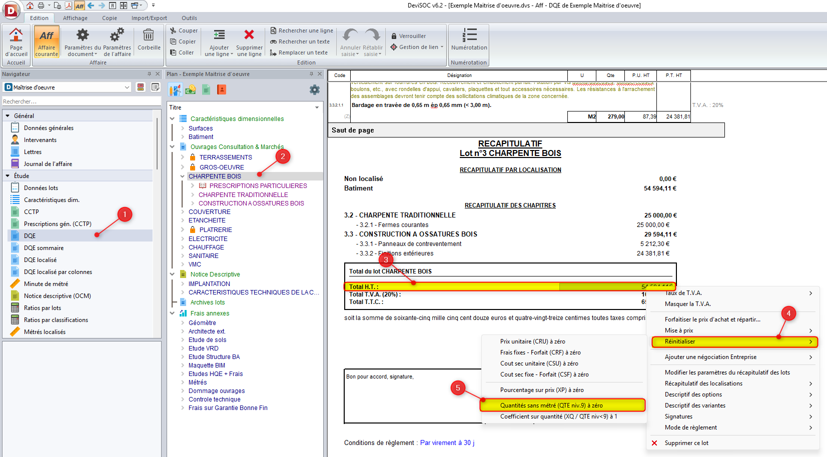 **Attention :** Cette fonction ne s’applique **que** aux prestations **sans métrés**. Si une prestation contient des métrés, vous devrez **les supprimer manuellement** pour remettre sa quantité à zéro.
