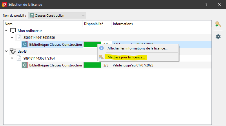 3 : Quand la liste des licences apparait, cliquez droit sur la ligne de licence pour mettre à jour