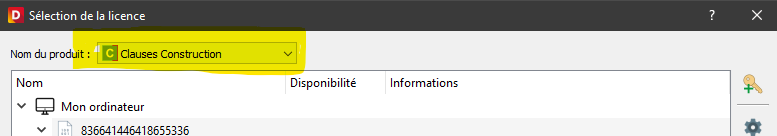 2 : Une fois sur la fenêtre de licence, sélectionnez le titre de votre licence dans 'Nom du produit'